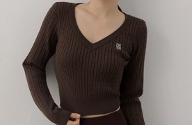 This fine-knit top feels smooth and soft against the skin with a non-itch finish. Delicate logo embroidery at the chest pairs beautifully with the classic V-neckline to flatter the face and highlight the neck and collarbone for a slimmer look. The cropped silhouette is designed to refine proportions, while the ribbed hem gently cinches the waist to visually lengthen the lower body line.
