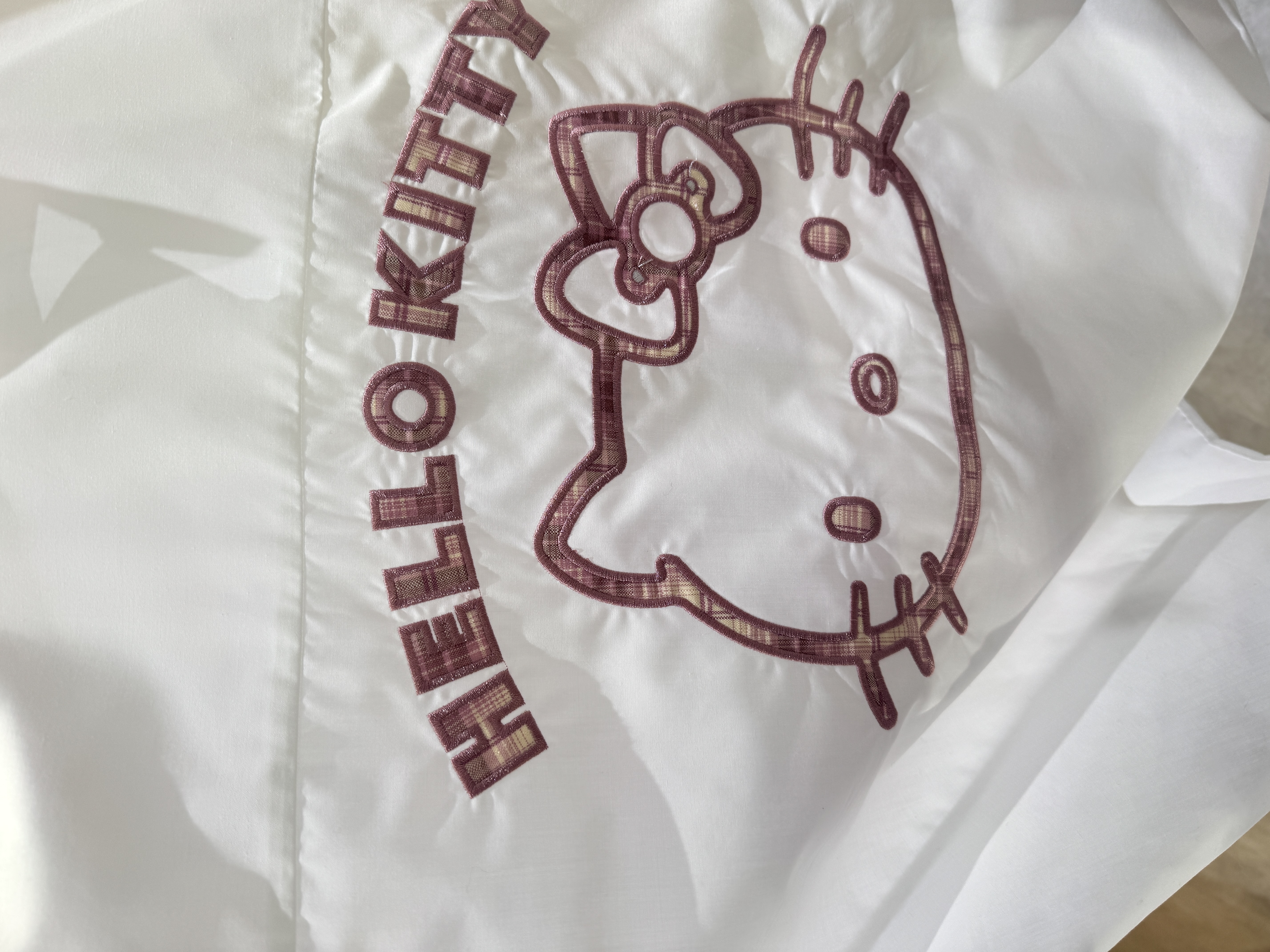 The statement Kitty head embroidery on the back becomes the focal point, instantly breaking away from the usual plain shirt look. Cut in a relaxed silhouette with a lightly structured fabric, it holds its shape beautifully and flatters the figure. Wear it on its own or layer it up to show off a cool-yet-cute style, and pair with jeans or a mini skirt for a highly recognizable everyday outfit.
