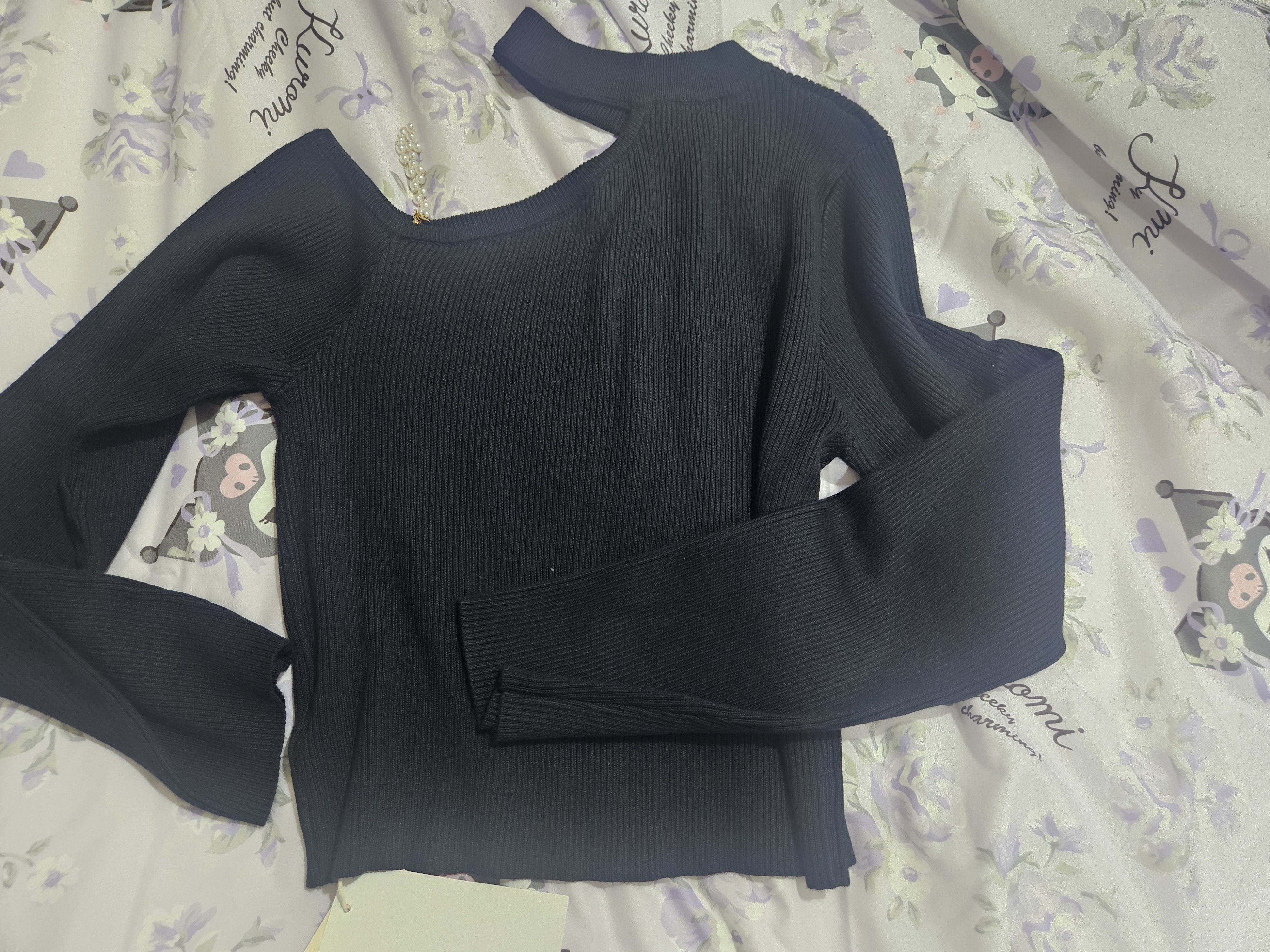 Product Description: One-shoulder cutout with pearl chain detail / Remove pearls before washing