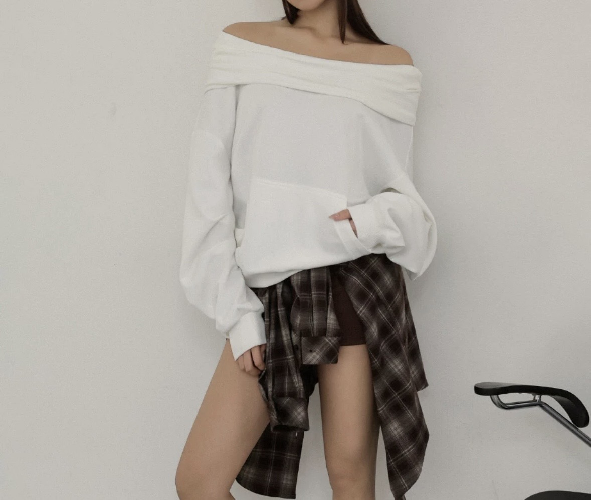This top features a wide folded neckline that can be worn straight across or off-shoulder for versatile styling. The front pocket adds subtle dimension while remaining practical. The relaxed fit and adjustable hood make it easy to achieve a casual yet stylish streetwear look.