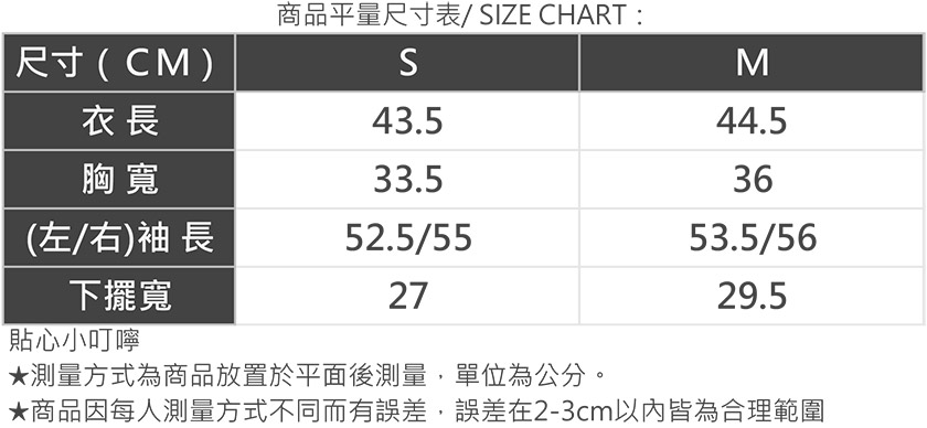 不確定自己的尺寸嗎?別擔心,我們幫你搞定。你可以參考下方商品評量尺寸表或是身材測量方式找到最適合你的尺碼,如果還有疑問也歡迎隨時聯繫我們的客服團隊。