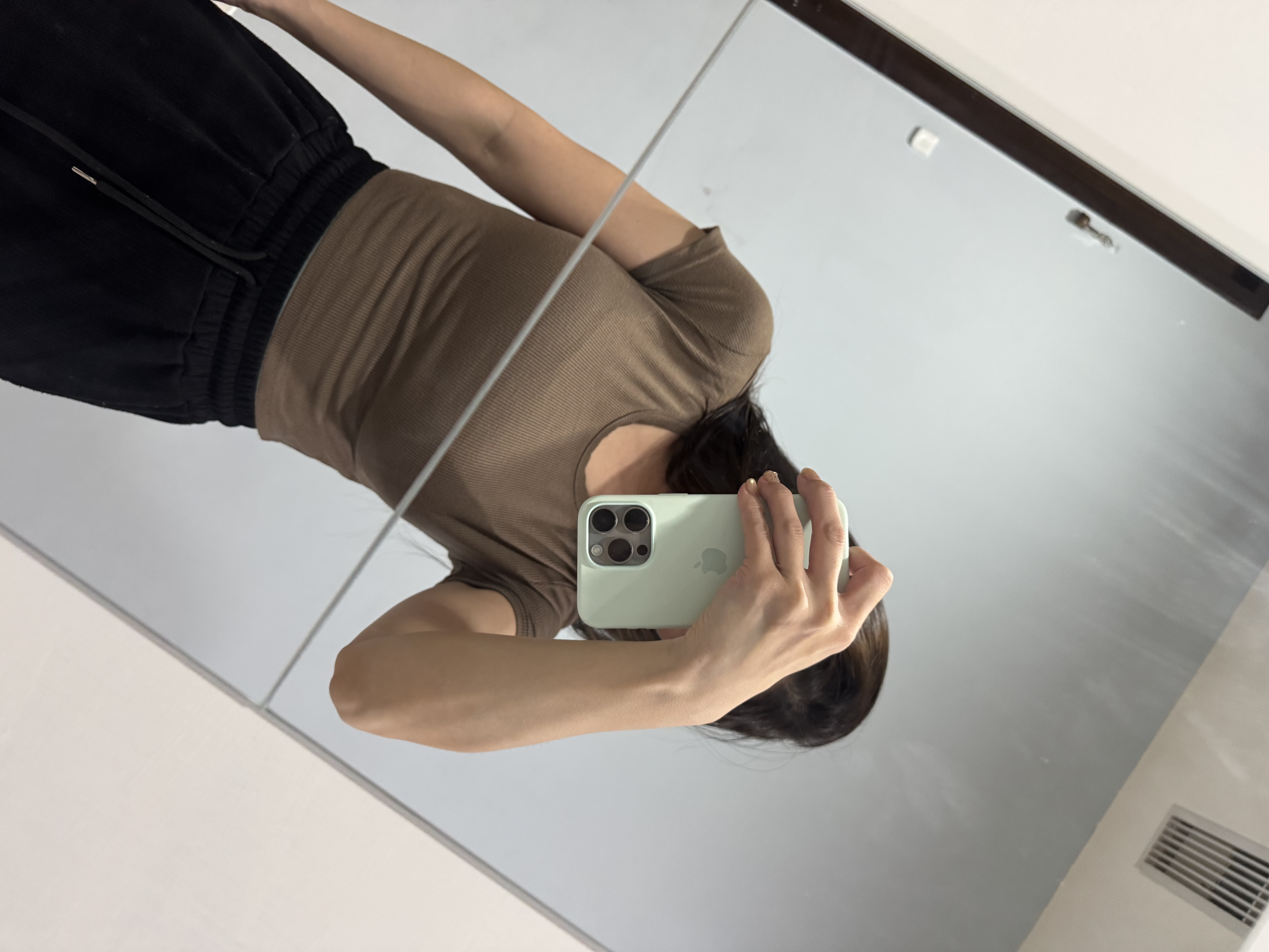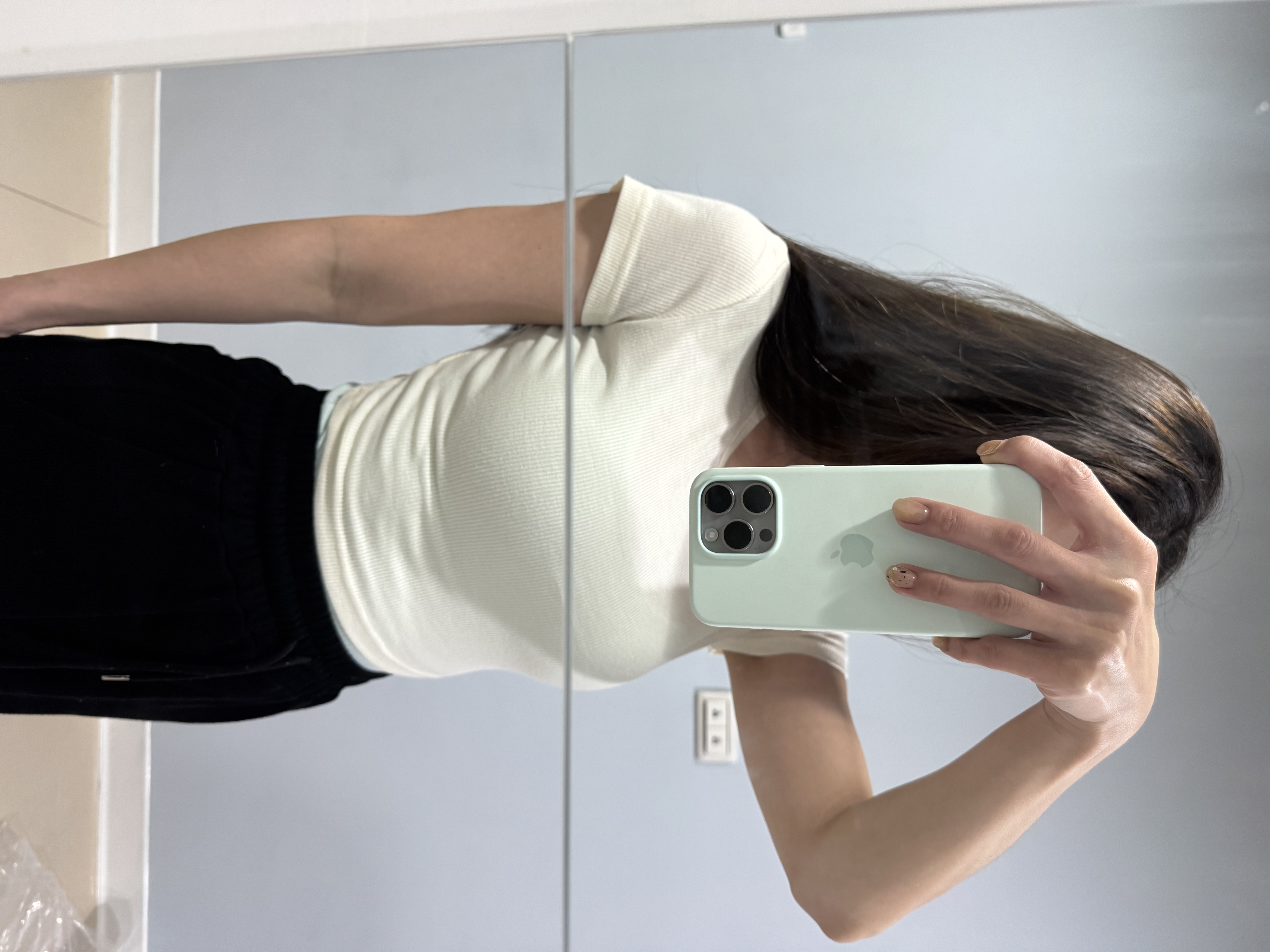 版型偏短手抬高很容易露出腰跟肚臍,但材質還算不錯,洗了多次不會有變形感,下半身很適合配高腰闊腿褲