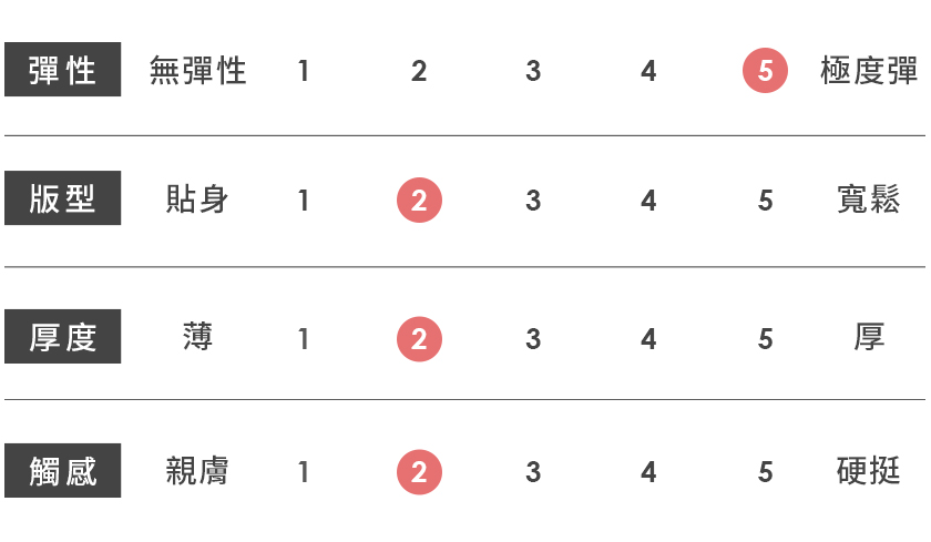 | 觸感 | 親膚 | 1 | 2 | 3 | 4 | 5 | 硬挺 |