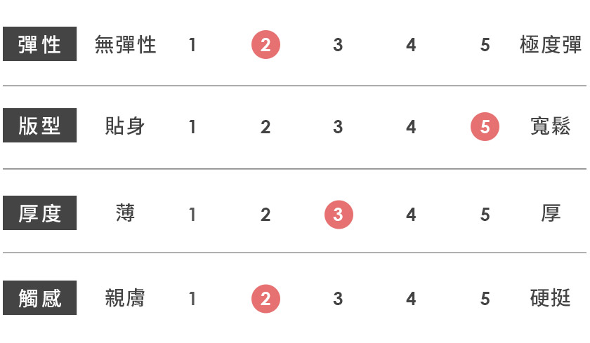 觸感 | 親膚 | 1 | 2 | 3 | 4 | 5 | 硬挺 |