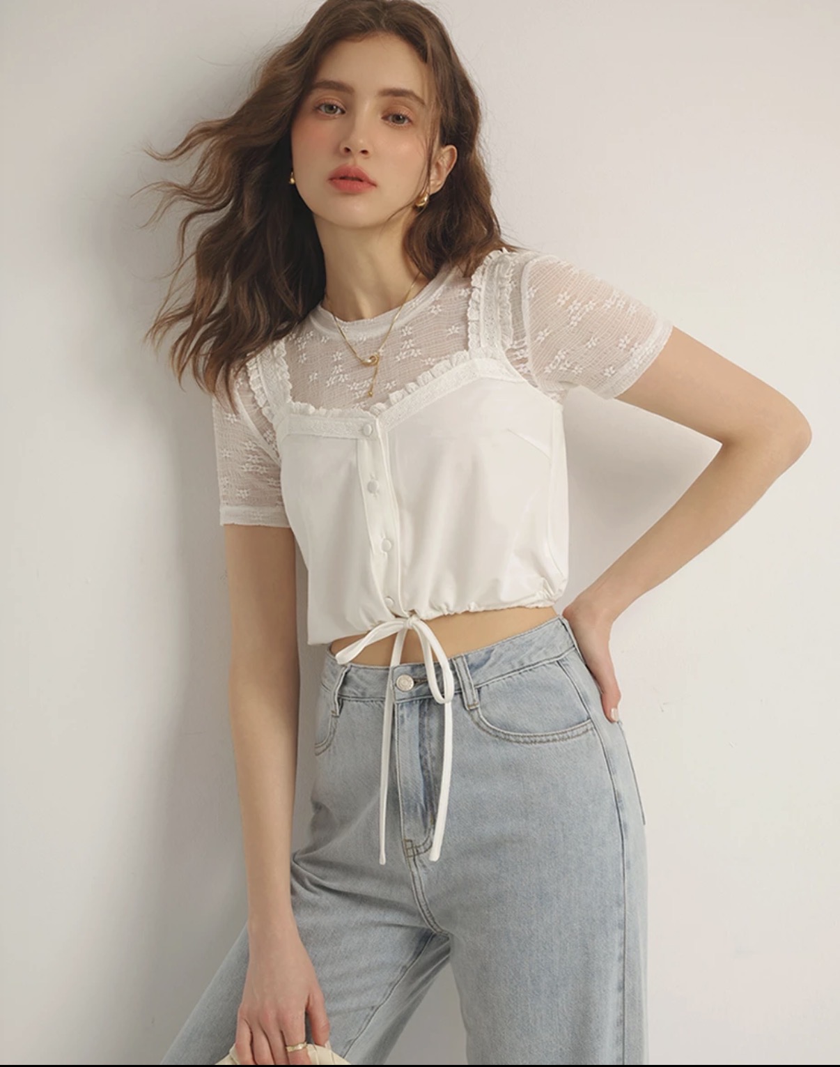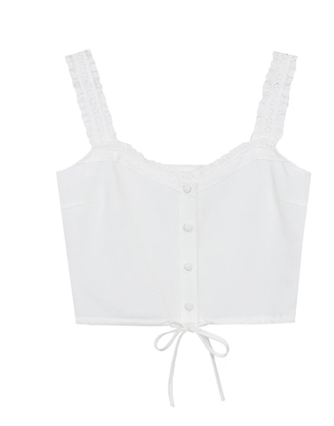 Lace Trim Buttoned Crop Cami Top with Drawstring Hem