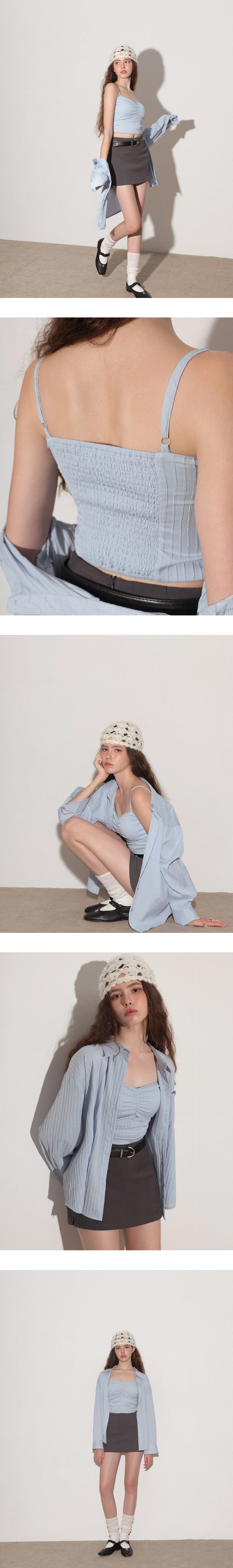 立體條紋抓皺細肩帶背心長袖襯衫套裝(附胸墊)