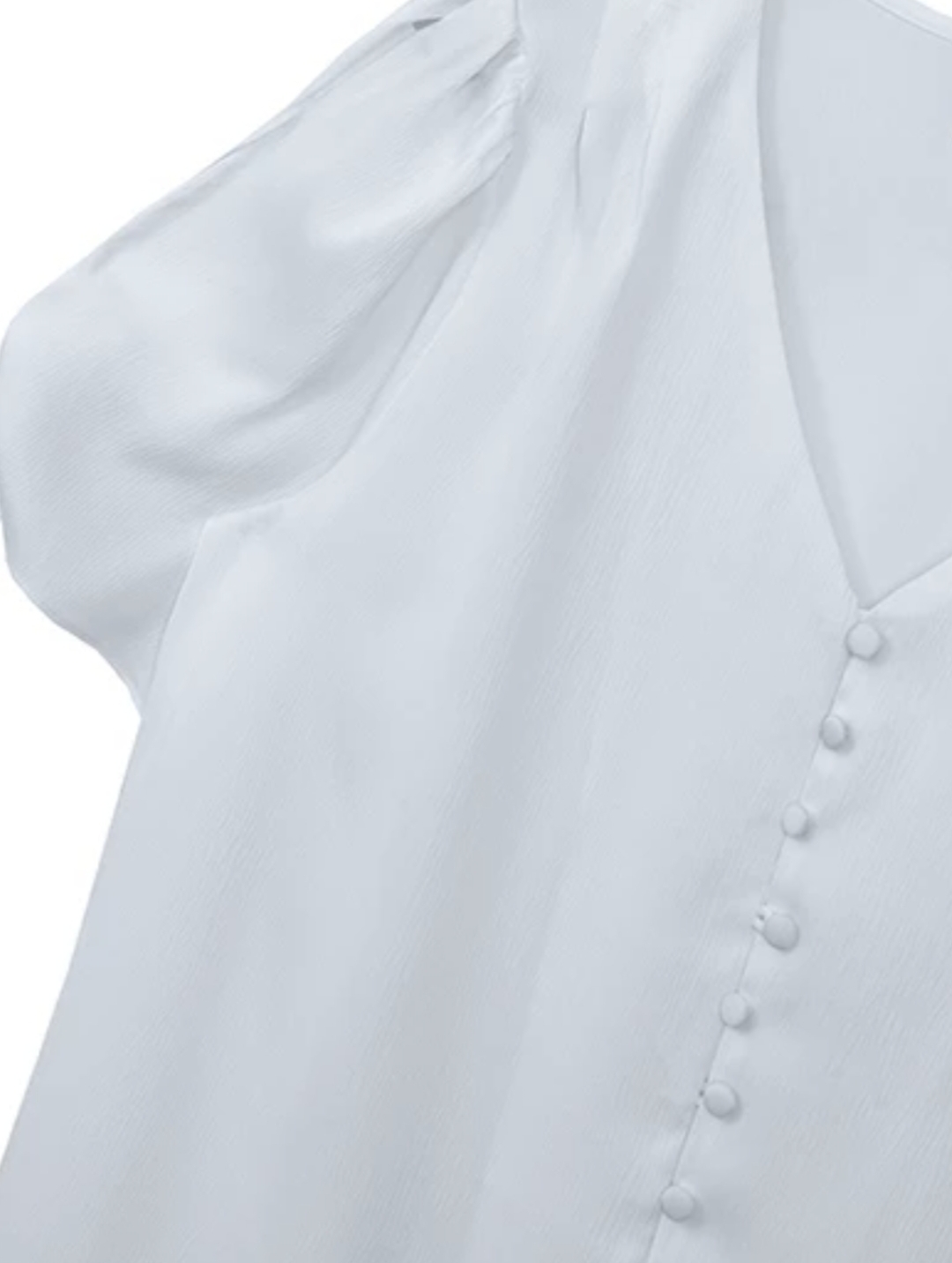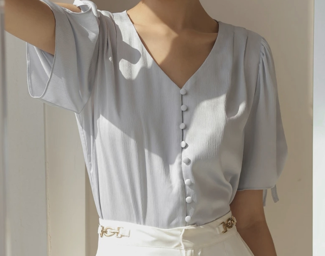 V領包扣綁結澎袖上衣