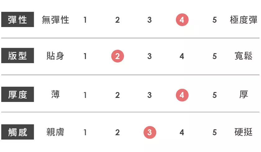 | 觸感 | 親膚 | 1 | 2 | 3 | 4 | 5 | 硬挺 |
