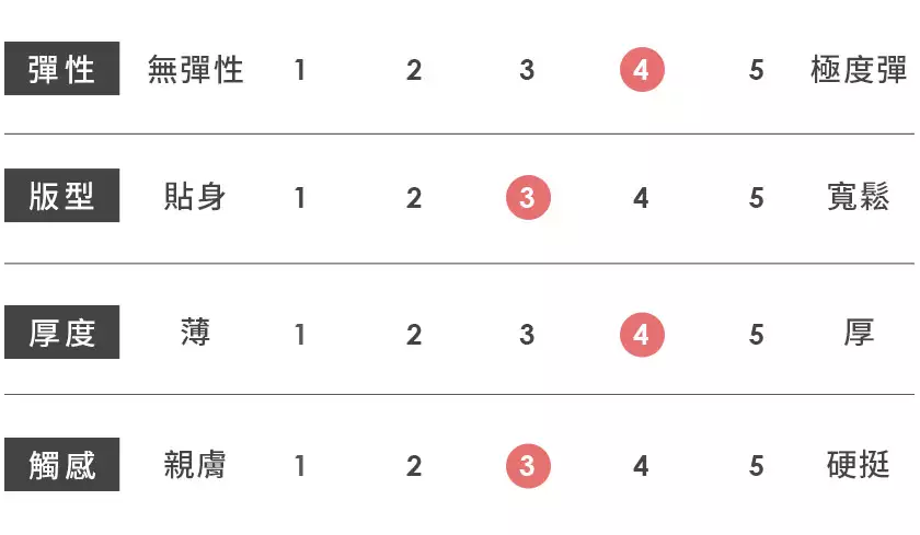 | 觸感 | 親膚 | 1 | 2 | 3 | 4 | 5 | 硬挺 |