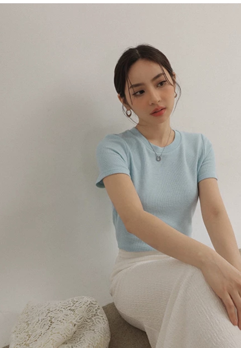 Slightly Sheer Waffle Knit Crew Round Neck Short Sleeves Top