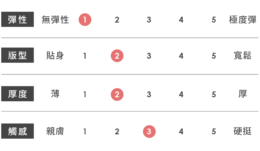 | 觸感 | 親膚 | 1 | 2 | 3 | 4 | 5 | 硬挺 |