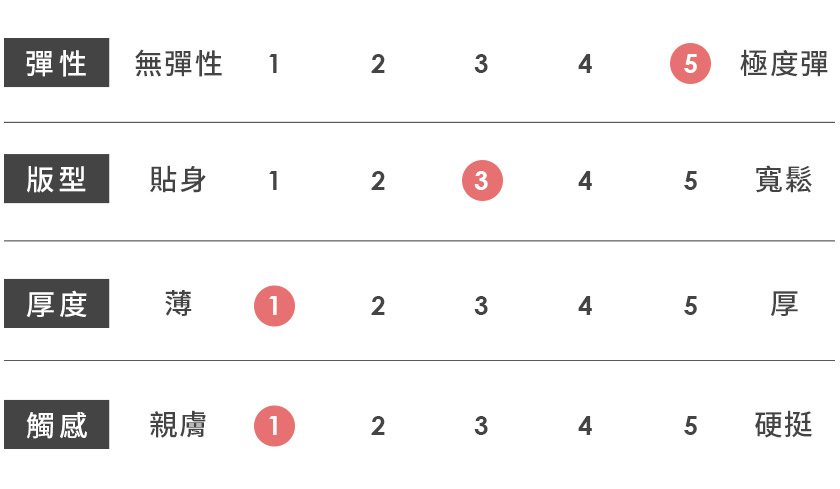| 觸感 | 親膚 | 1 | 2 | 3 | 4 | 5 | 硬挺 |