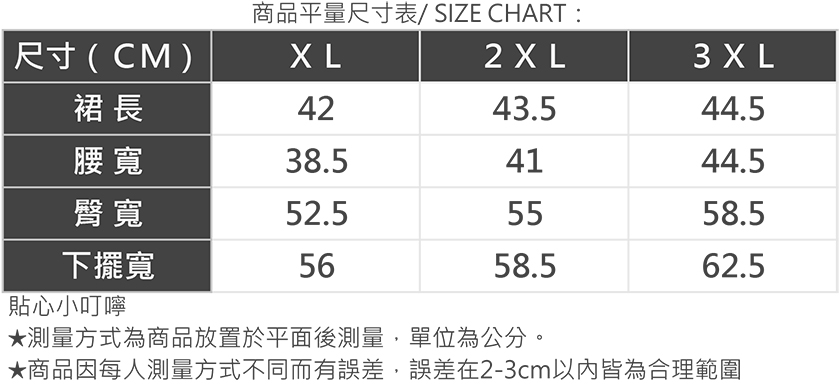 不確定自己的尺寸嗎?別擔心,我們幫你搞定。你可以參考下方商品評量尺寸表或是身材測量方式找到最適合你的尺碼,如果還有疑問也歡迎隨時聯繫我們的客服團隊。