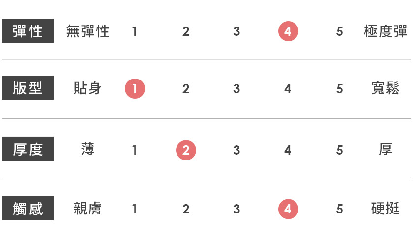 | 觸感 | 親膚 | 1 | 2 | 3 | 4 | 5 | 硬挺 |