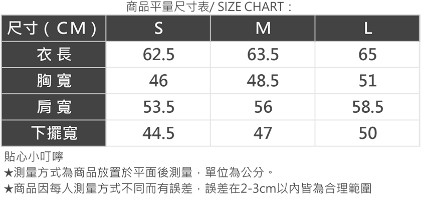 不確定自己的尺寸嗎?別擔心,我們幫你搞定。你可以參考下方商品評量尺寸表或是身材測量方式找到最適合你的尺碼,如果還有疑問也歡迎隨時聯繫我們的客服團隊。
