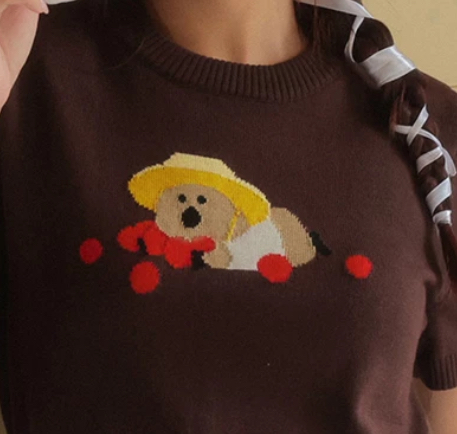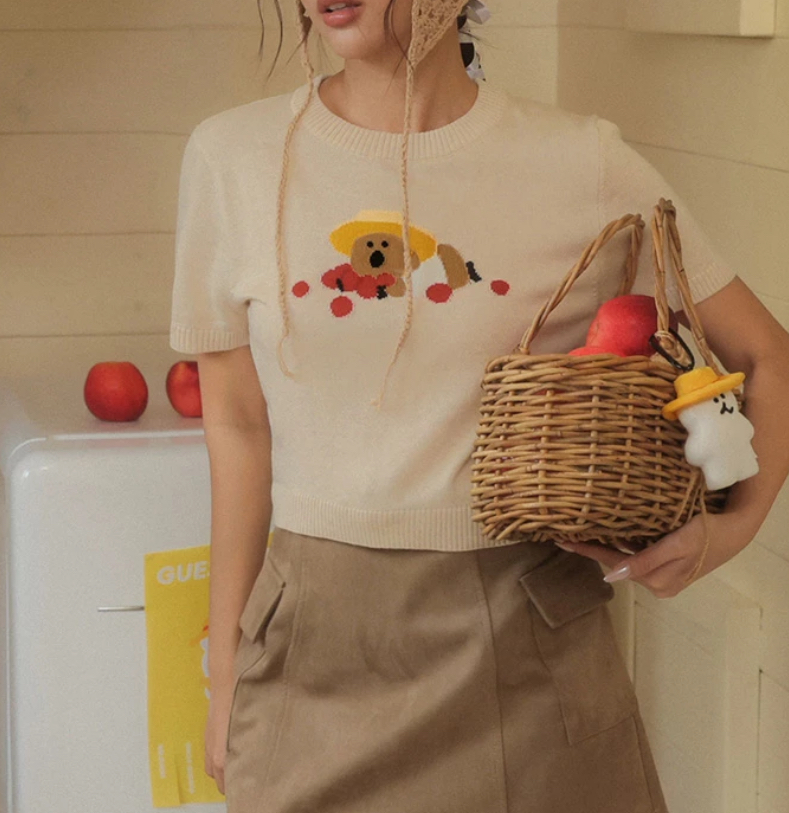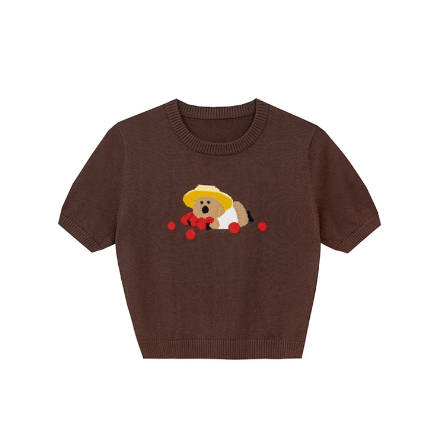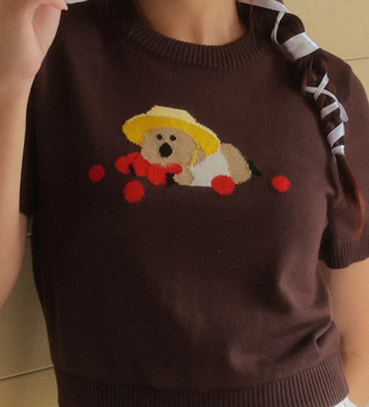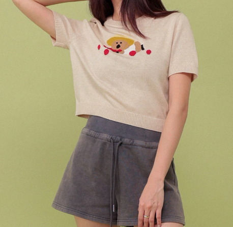【DINOTAENG】Graphic Short Sleeve Knit Crop Top