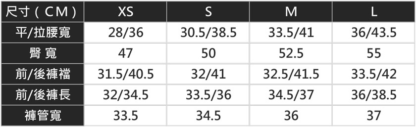 | 版型 | 貼身 | 1 | 2 | 3 | 4 | 5 | 寬鬆 |
