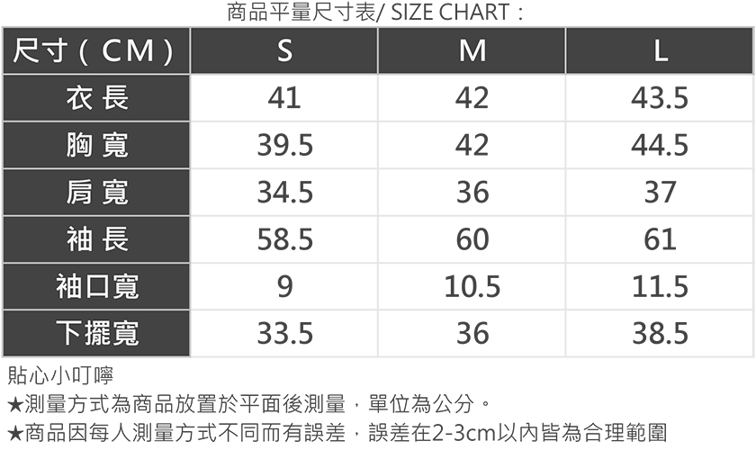 | 版型 | 貼身 | 1 | 2 | 3 | 4 | 5 | 寬鬆 |