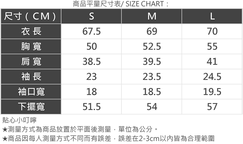 | 版型 | 貼身 | 1 | 2 | 3 | 4 | 5 | 寬鬆 |