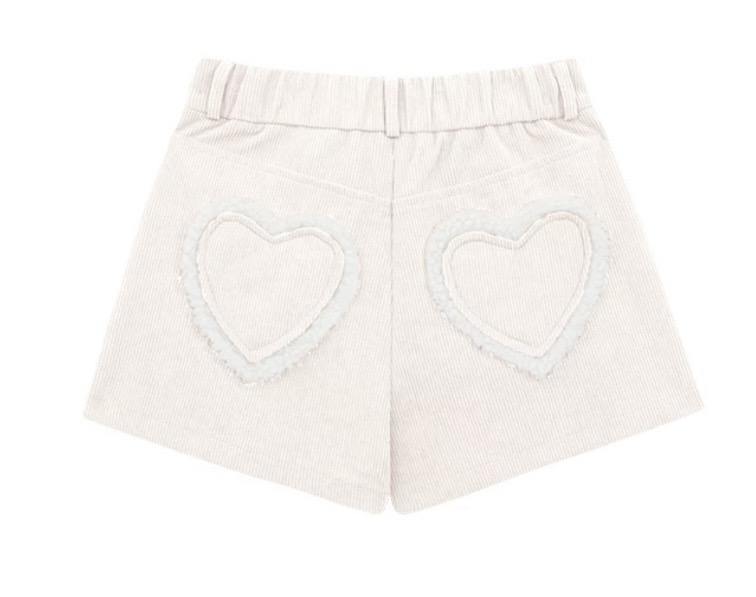Crafted from finely textured corduroy fabric with a moderate thickness, this piece maintains a structured silhouette when worn. A playful heart patch detail at the back is accented with cozy sherpa trim, adding a cute and charming touch. The mid-rise, streamlined fit avoids bulkiness and pairs perfectly with cropped tops or knitwear for an easy, balanced look.