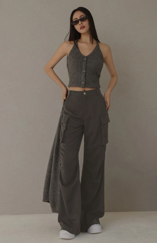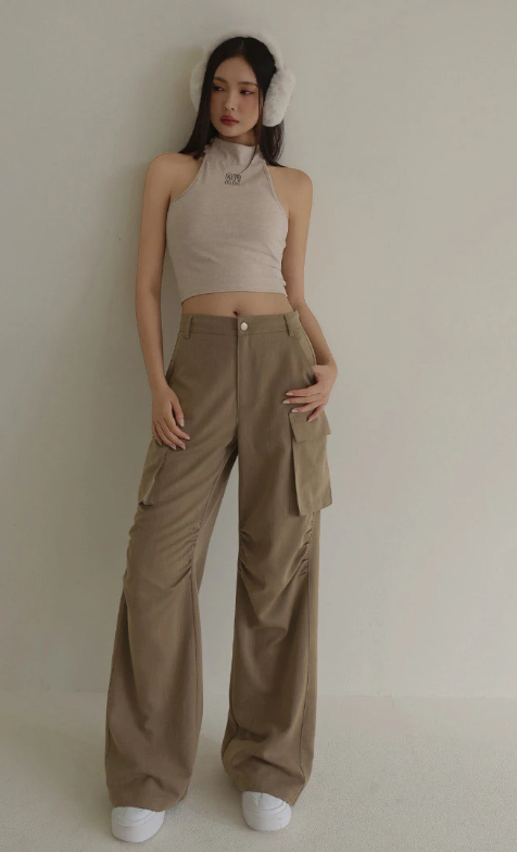 Ruched Seams Detail Tailored Cargo Wide Leg Pants with Pockets