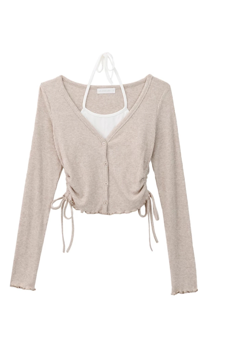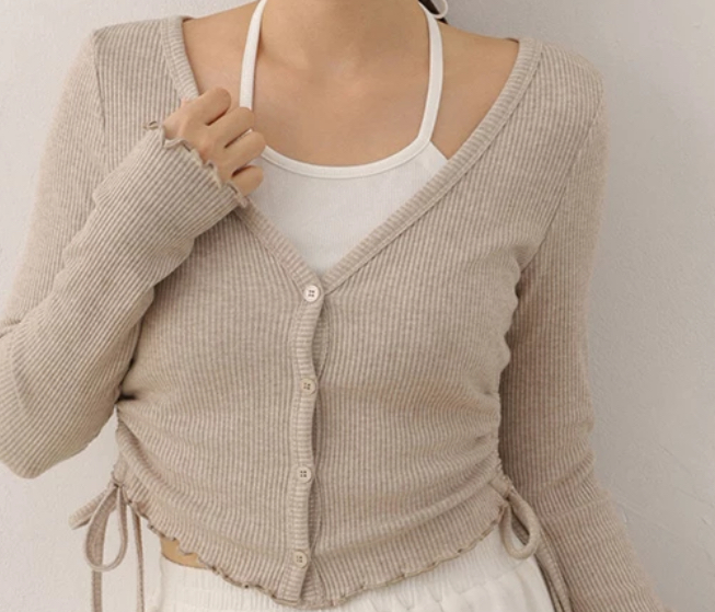 Faux 2 Piece Lettuce Hem Ruched Side Drawstring Cardigan