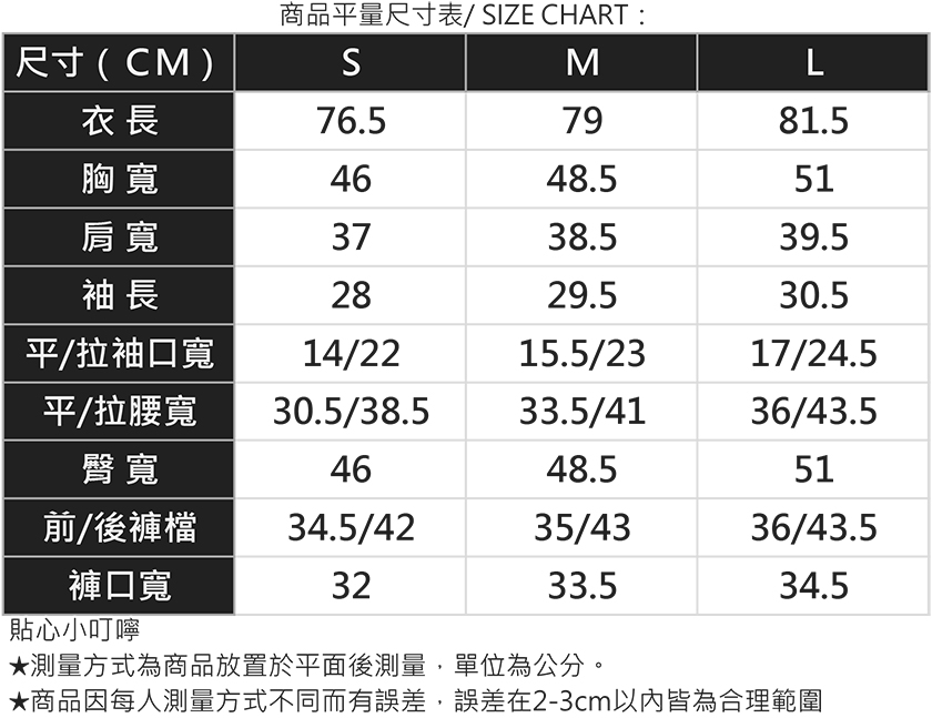 商品描述:開釦設計/ 附口袋/後腰圍附鬆緊/ 袖口附鬆緊