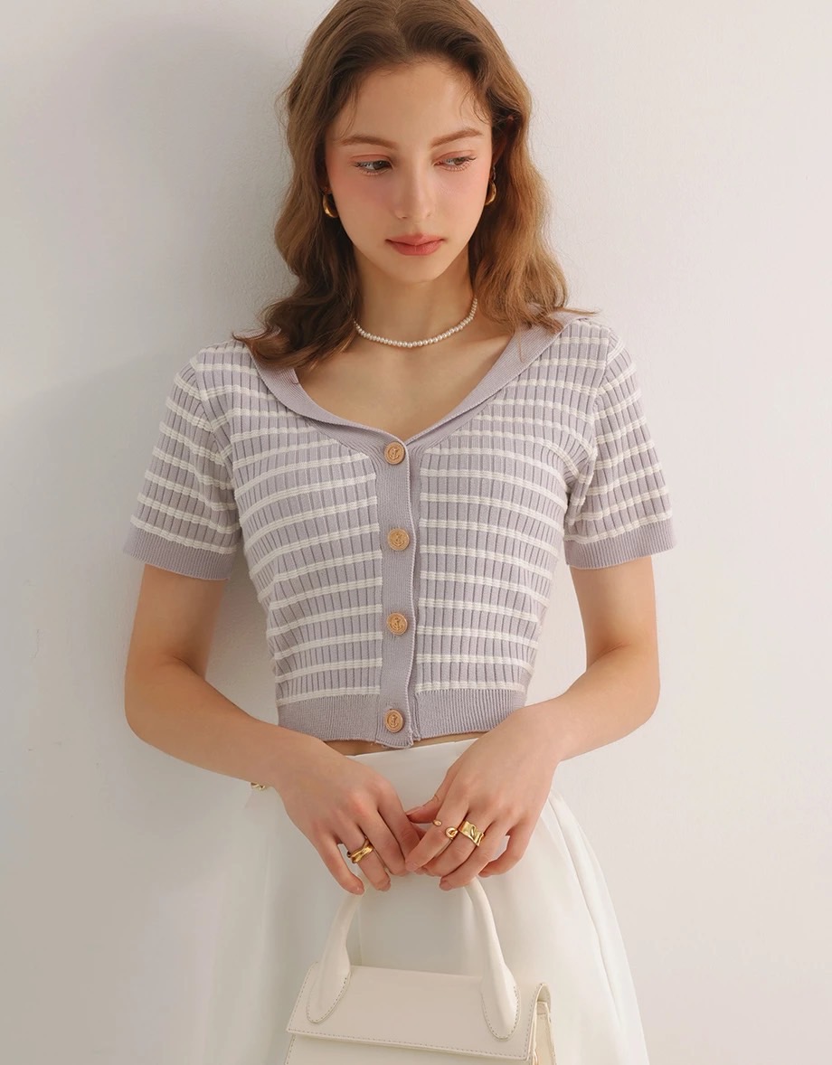 Striped Knit Mini Dress with Collar and Decorative Buttons
