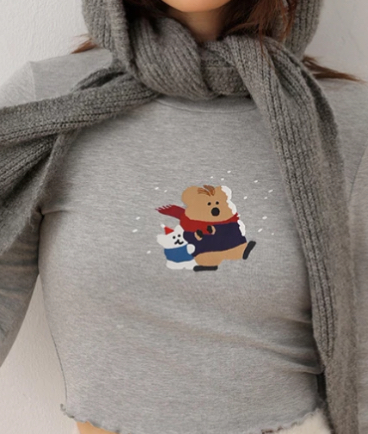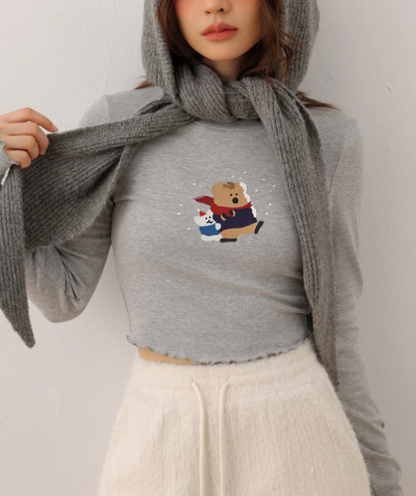 【DINOTAENG】Printed Long Sleeve Crop Top Tee With Inner Fleece And Ruffled Hem
