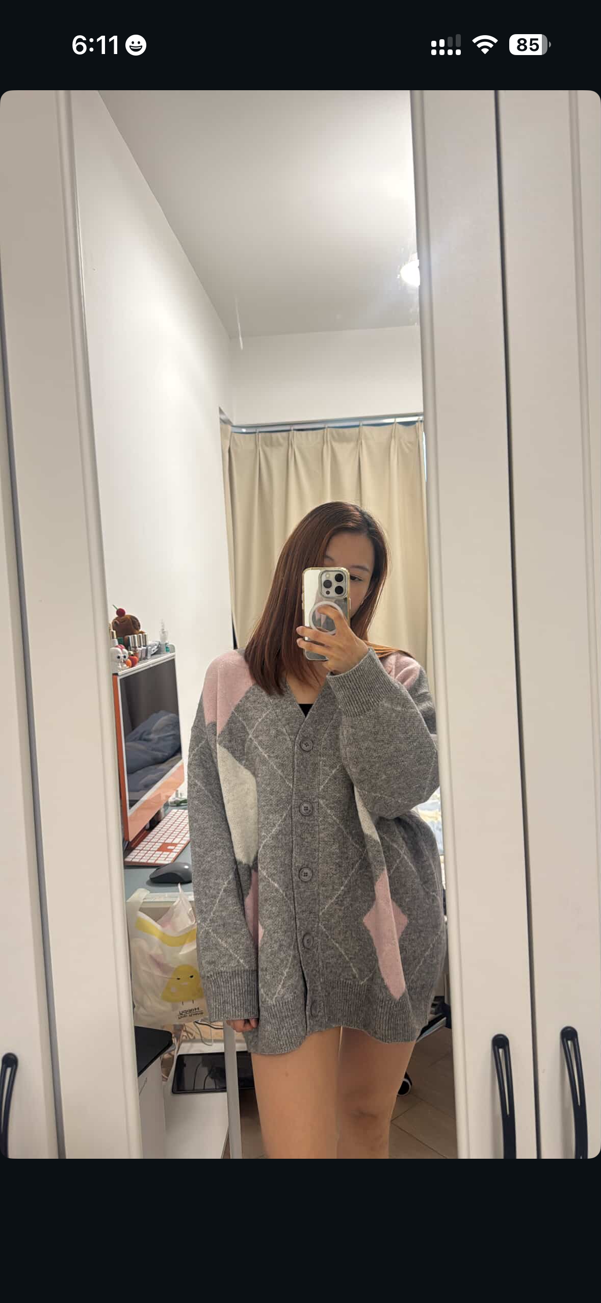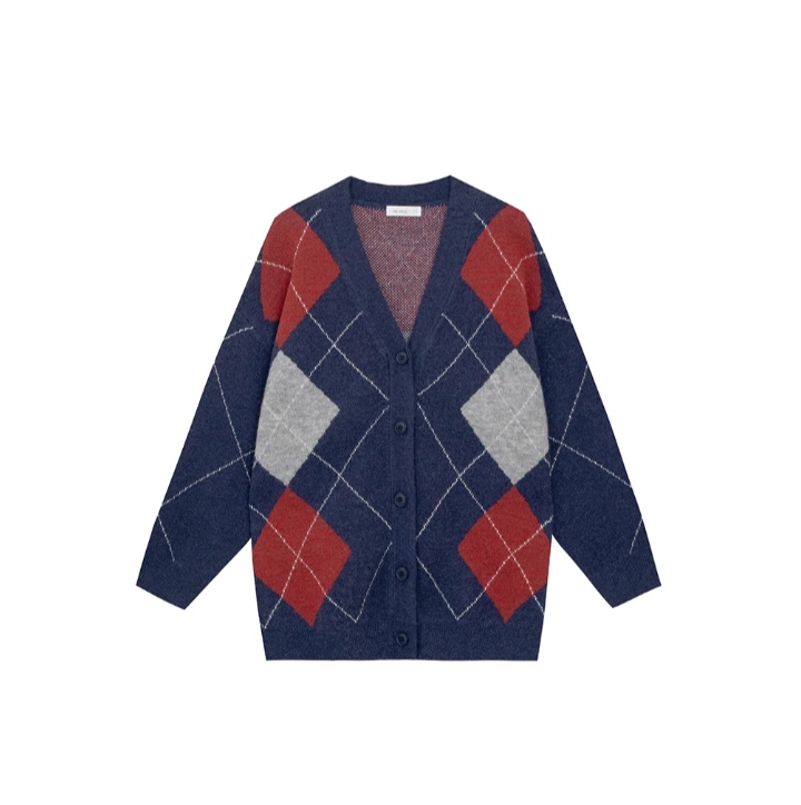 學院風菱格V領寬版開襟針織衫
