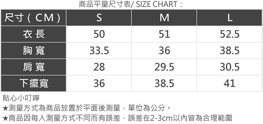 | 版型 | 貼身 | 1 | 2 | 3 | 4 | 5 | 寬鬆 |