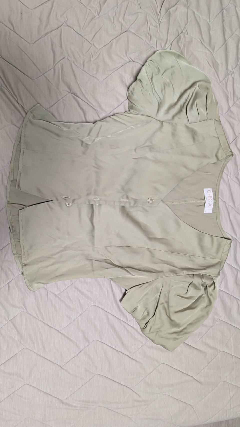 V 領+澎袖很修飾肩頸跟手臂,後扭結和收腰設計讓腰線更明顯,上身超顯瘦。織紋面料有質感,排扣細節也很加分;穿起來不會刺癢,活動也不太受限。搭高腰褲或長裙都很有女人味,是會想常穿的一件。