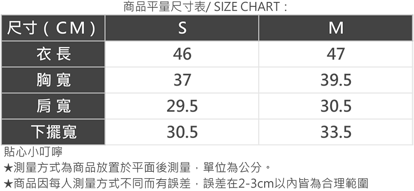 不確定自己的尺寸嗎?別擔心,我們幫你搞定。你可以參考下方商品評量尺寸表或是身材測量方式找到最適合你的尺碼,如果還有疑問也歡迎隨時聯繫我們的客服團隊。