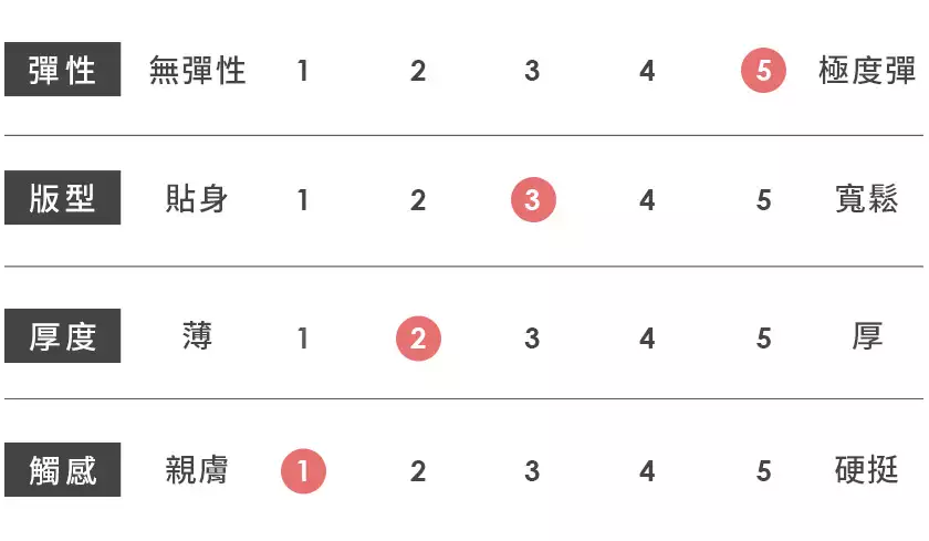 | 彈性 | 無彈性 | 1 | 2 | 3 | 4 | 5 | 極度彈 |