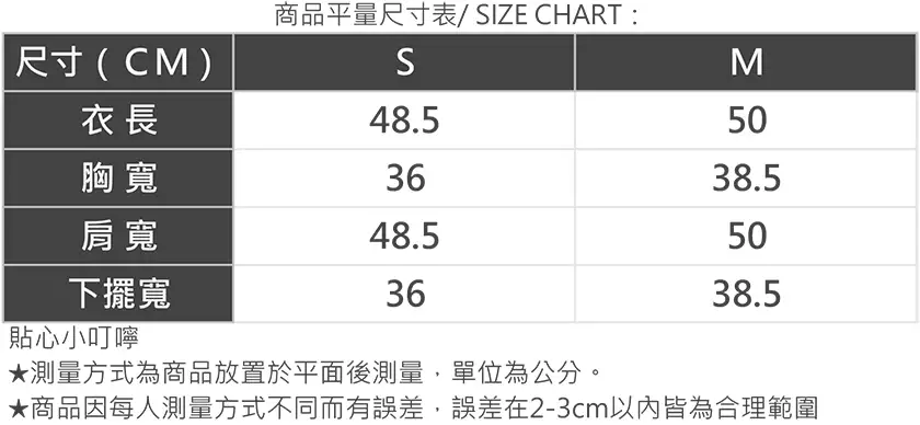 不確定自己的尺寸嗎?別擔心,我們幫你搞定。你可以參考下方商品評量尺寸表或是身材測量方式找到最適合你的尺碼,如果還有疑問也歡迎隨時聯繫我們的客服團隊。
