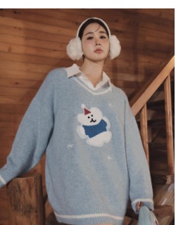 【DINOTAENG】V-Neck Long Sleeves Embroidery Knit Sweater