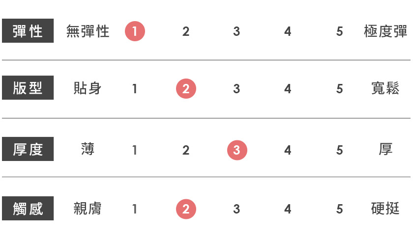 | 觸感 | 親膚 | 1 | 2 | 3 | 4 | 5 | 硬挺 |