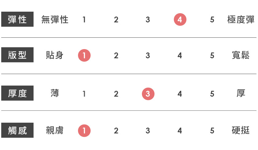 | 觸感 | 親膚 | 1 | 2 | 3 | 4 | 5 | 硬挺 |