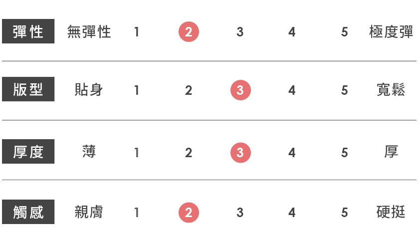| 觸感 | 親膚 | 1 | 2 | 3 | 4 | 5 | 硬挺 |