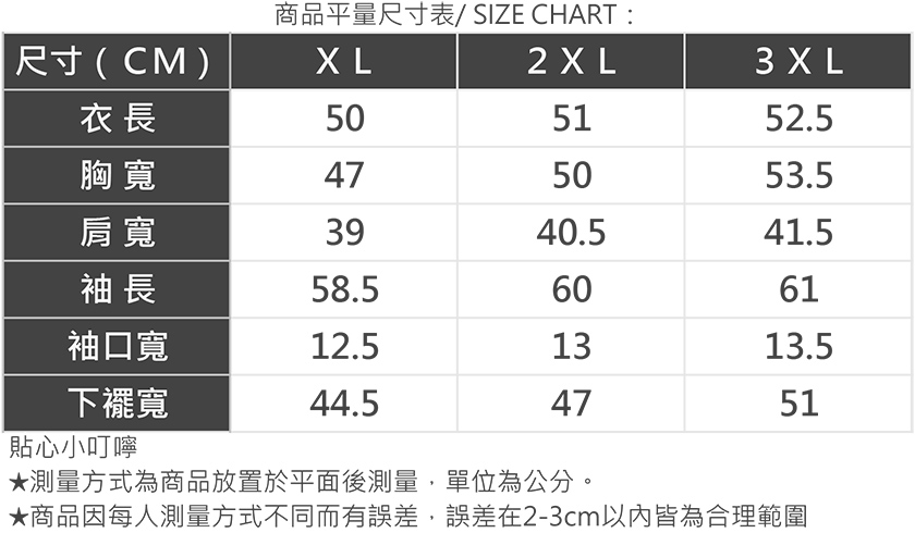 不確定自己的尺寸嗎?別擔心,我們幫你搞定。你可以參考下方商品評量尺寸表或是身材測量方式找到最適合你的尺碼,如果還有疑問也歡迎隨時聯繫我們的客服團隊。