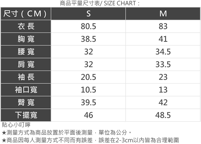 | 版型 | 貼身 | 1 | 2 | 3 | 4 | 5 | 寬鬆 |
