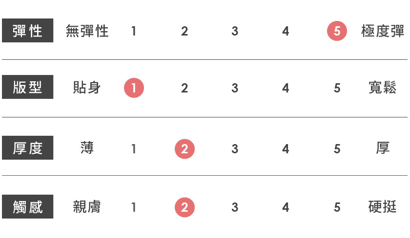 | 觸感 | 親膚 | 1 | 2 | 3 | 4 | 5 | 硬挺 |