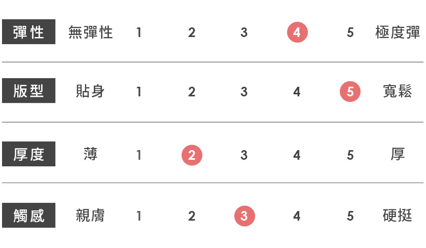 | 觸感 | 親膚 | 1 | 2 | 3 | 4 | 5 | 硬挺 |