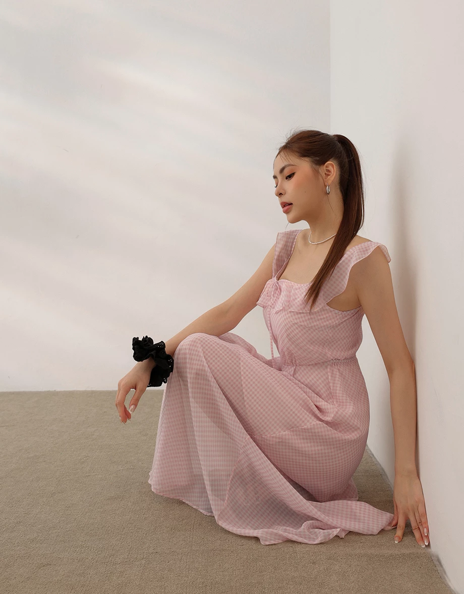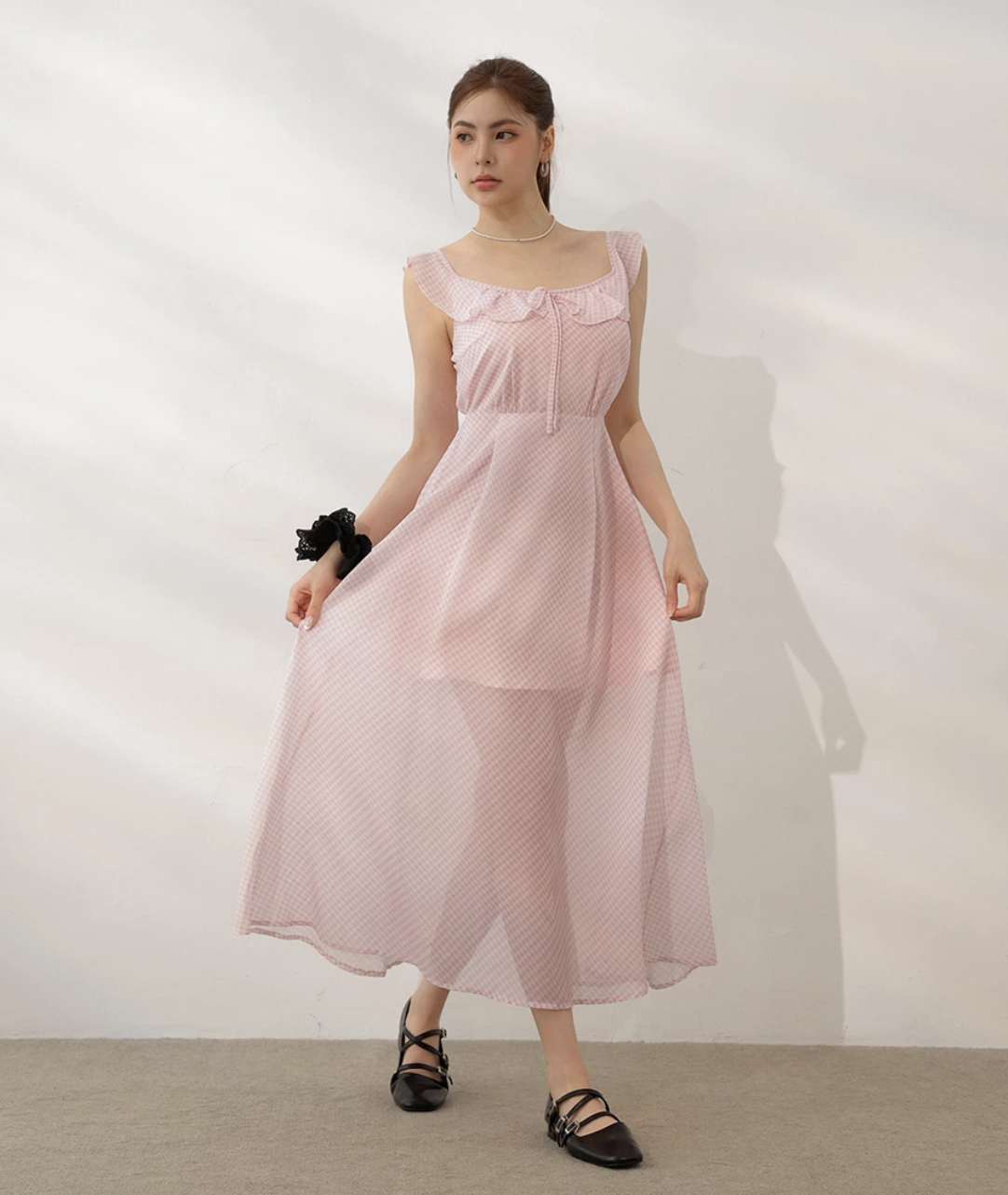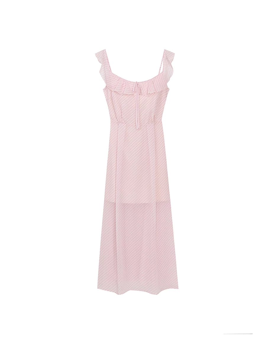 Sheer Ruffle Gingham Sleeveless Padded Maxi Dress
