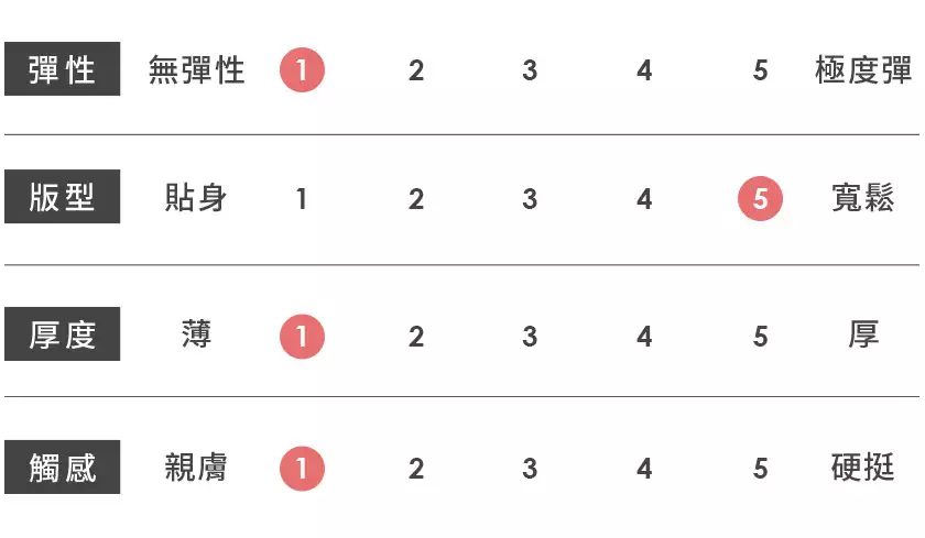 | 觸感 | 親膚 | 1 | 2 | 3 | 4 | 5 | 硬挺 |