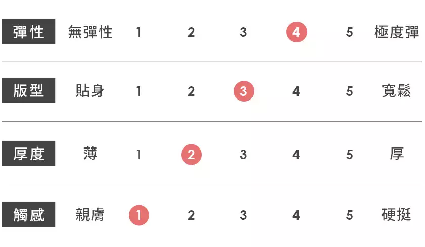| 觸感 | 親膚 | 1 | 2 | 3 | 4 | 5 | 硬挺 |