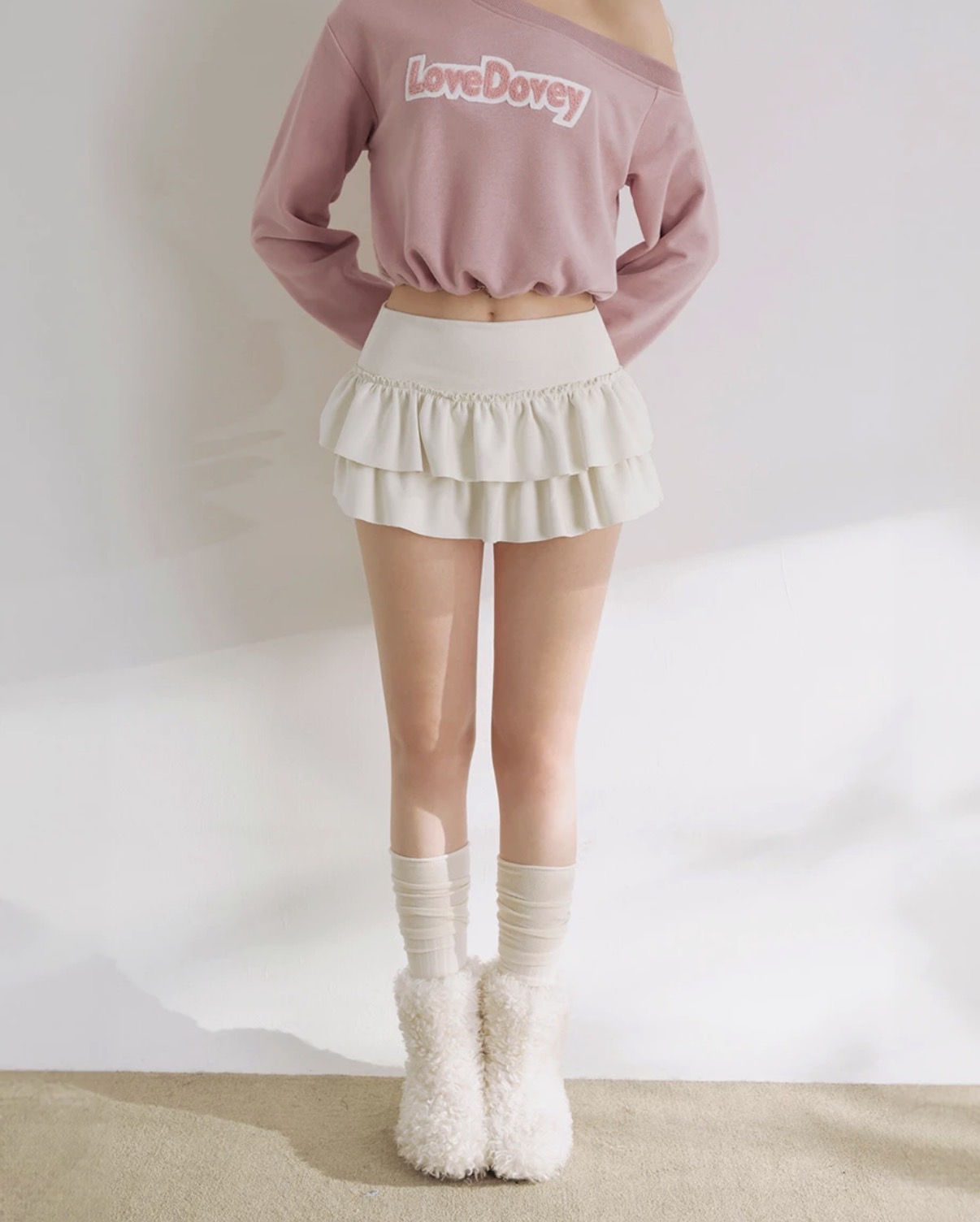 This ruffled tiered mini skirt features an elastic waistband that sits comfortably at the waist without feeling restrictive. The double-layer ruffle design adds dimensional volume while subtly contouring the hips and legs. Crafted from lightweight air-layer fabric, it feels breathable yet structured, maintaining a clean silhouette throughout the day. A must-have piece for creating sweet, feminine looks.