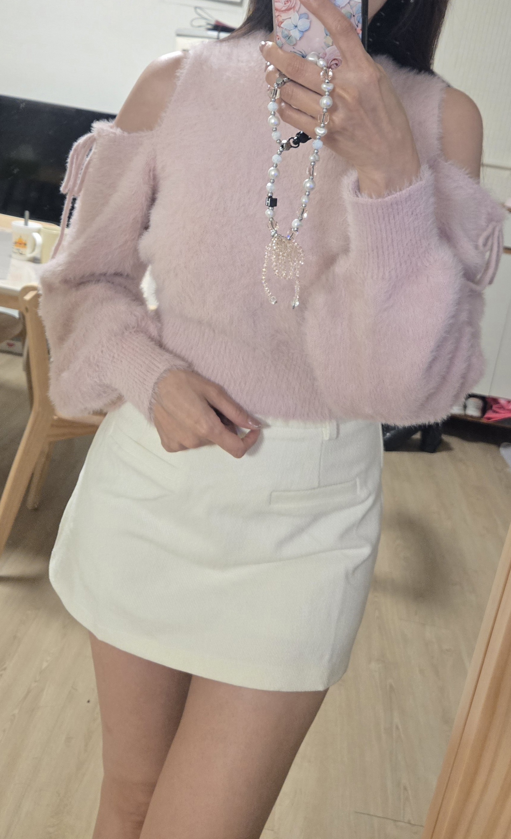This faux mink knit sweater features a plush, airy texture that feels soft against the skin without irritation. The cropped silhouette delivers a clean, lightweight look that redefines traditional bulky knitwear, while shoulder cut-out details with delicate tie accents introduce a refined touch of subtle sensuality for a modern winter statement.