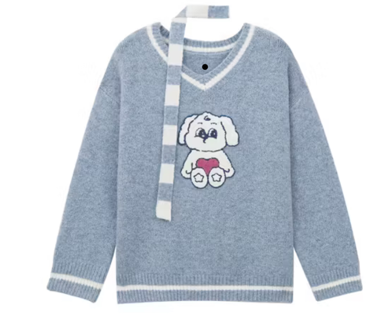 【Lyra & Toby】Lyra Bunny Print V Neck Knit Pullover Sweater (with Detachable Stripe Scarf Tie)