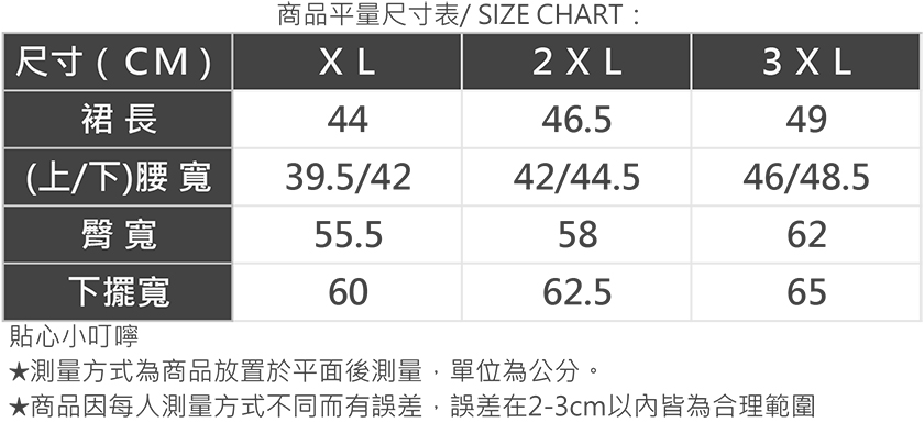 不確定自己的尺寸嗎?別擔心,我們幫你搞定。你可以參考下方商品評量尺寸表或是身材測量方式找到最適合你的尺碼,如果還有疑問也歡迎隨時聯繫我們的客服團隊。